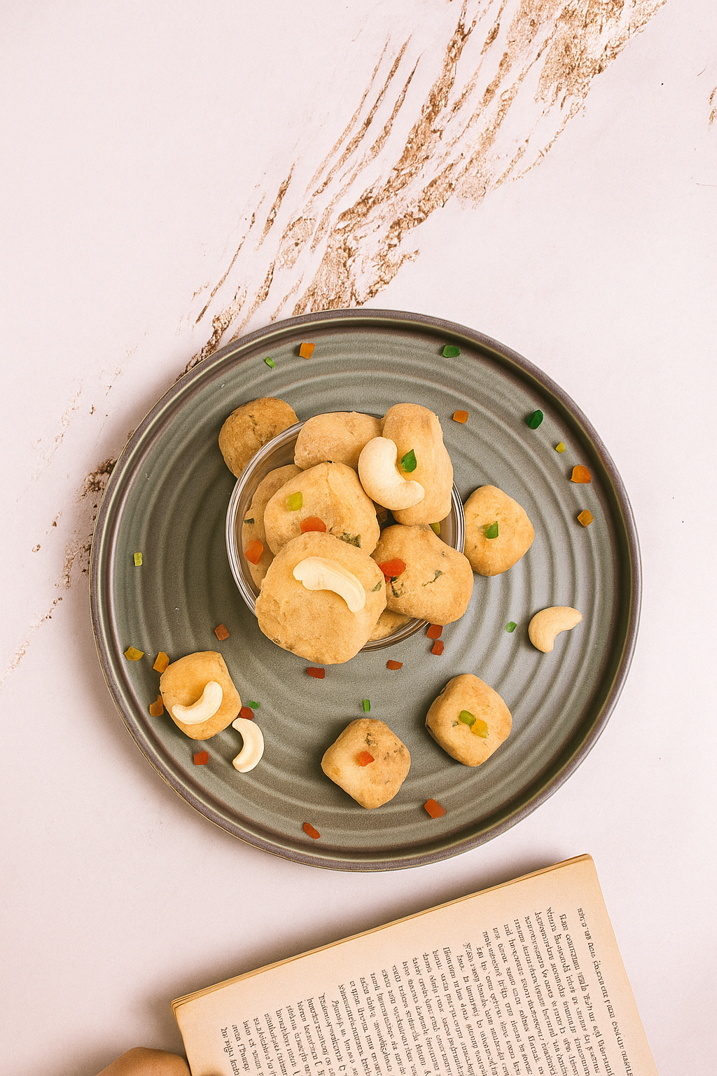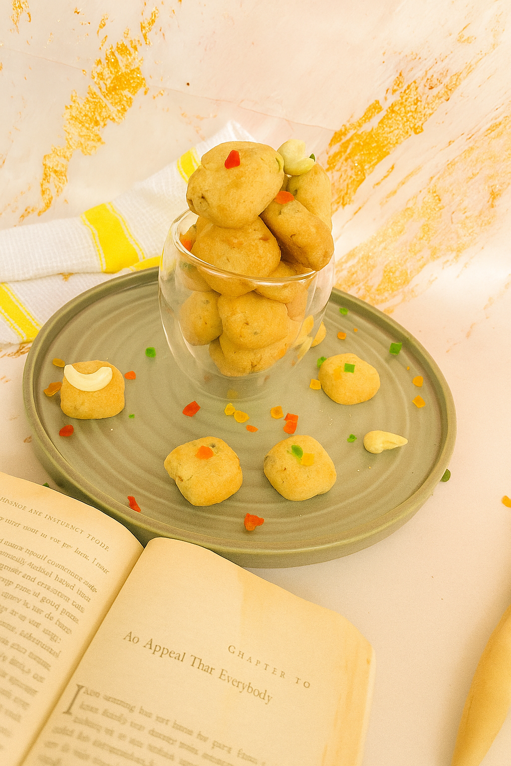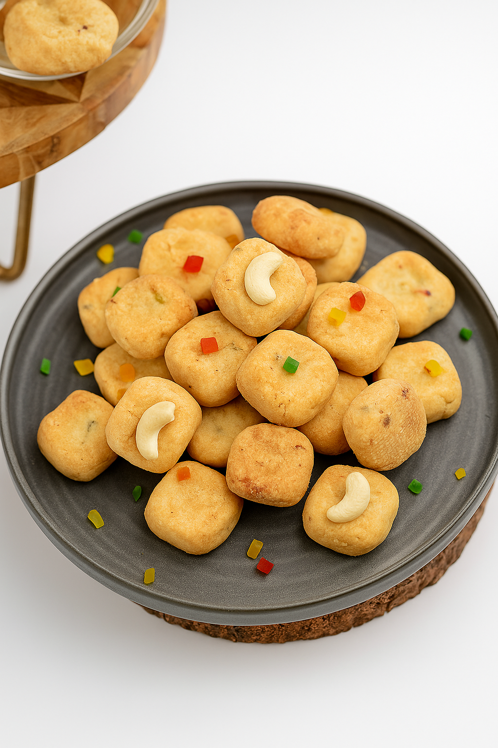 Ingredients:All-purpose flour , butter, sugar, cashews, tutti frutti (candied papaya), pineapple flavouring, rose flavouring, and . salt.